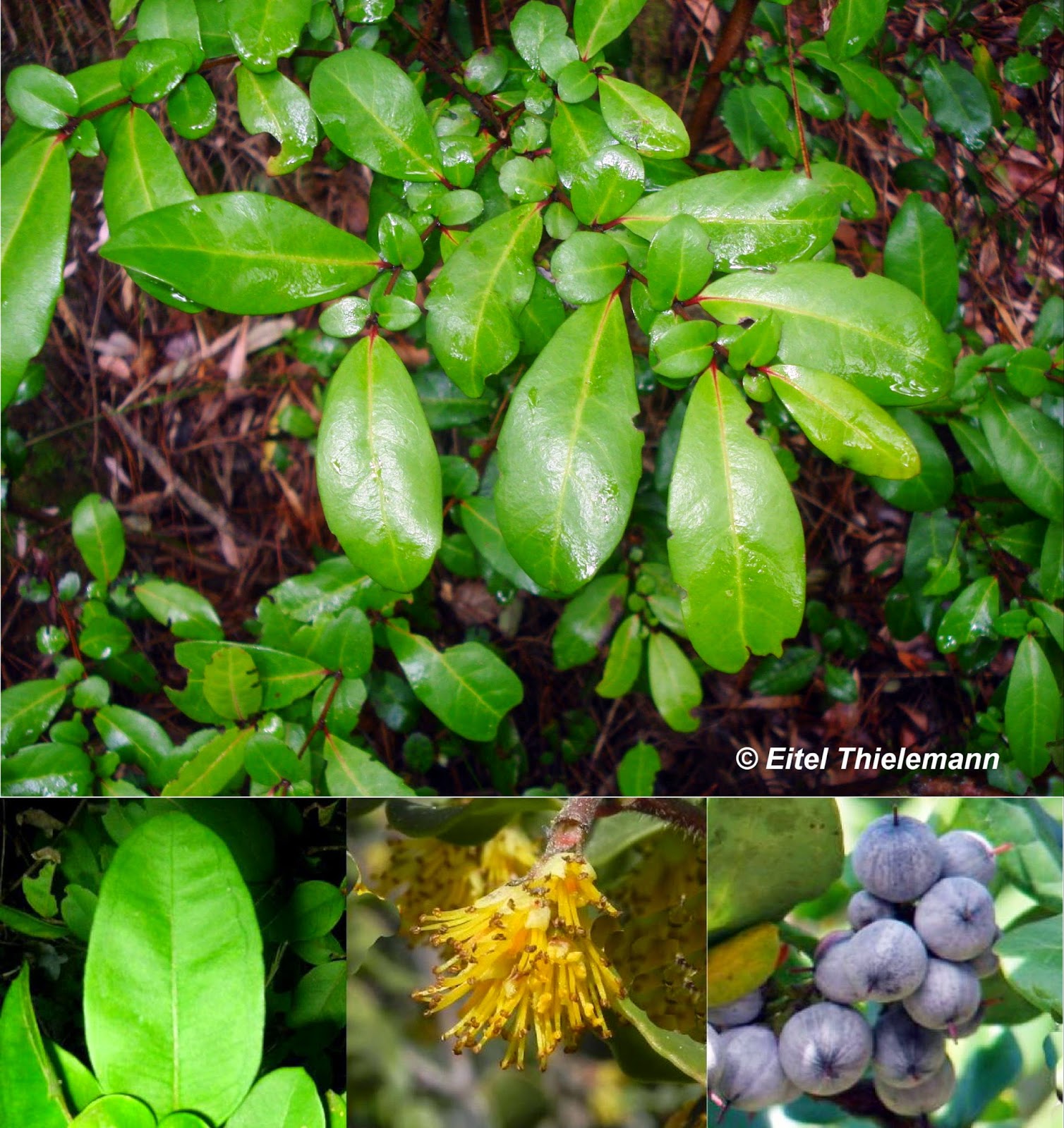 Arbusto siempreverde, endémico de Chile que crece entre Valparaíso y Osorno, donde alcanza una altura de 3 metros, presenta hojas alternas de borde entero con algunos dientes, ovaladas o elípticas, con estípulas foliosas, flores amarillas reunidas en un corimbo, de 4 tépalos y 20 estambres. Su fruto es una graciosa baya esférica de color gris, que le da un alto valor ornamental para parques y jardines. Fotografiado en Pucón, en febrero 2008.